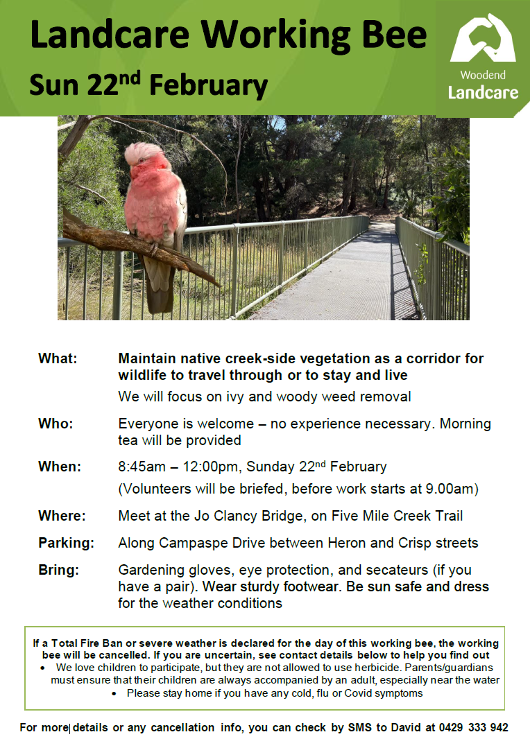 Our Thursday Crew continue to meet most weeks at various locations around town. Contact woodendlandcare@gmail.com to get your name on the mailing list to find out where to meet.
