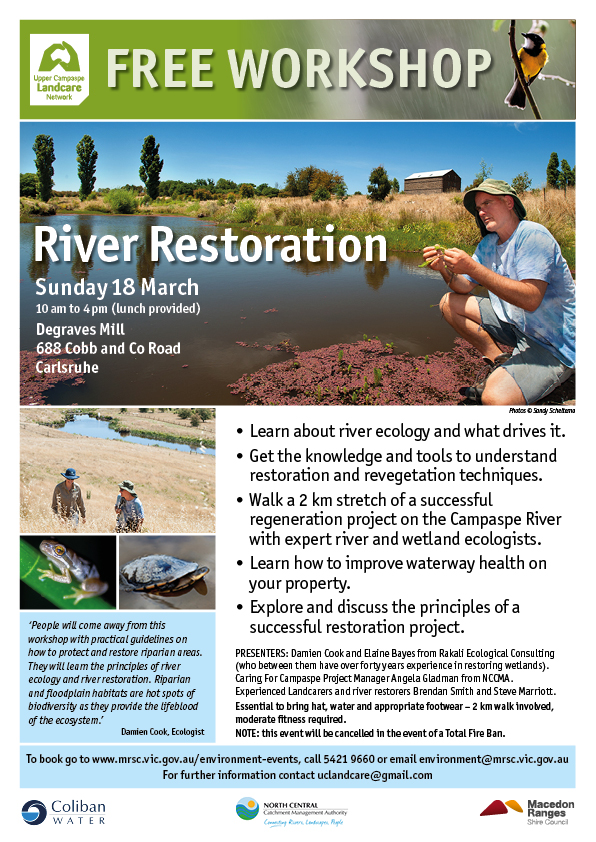 - Bring: secateurs, gloves, whipper snippers. The landcare tool trailer will be onsite.