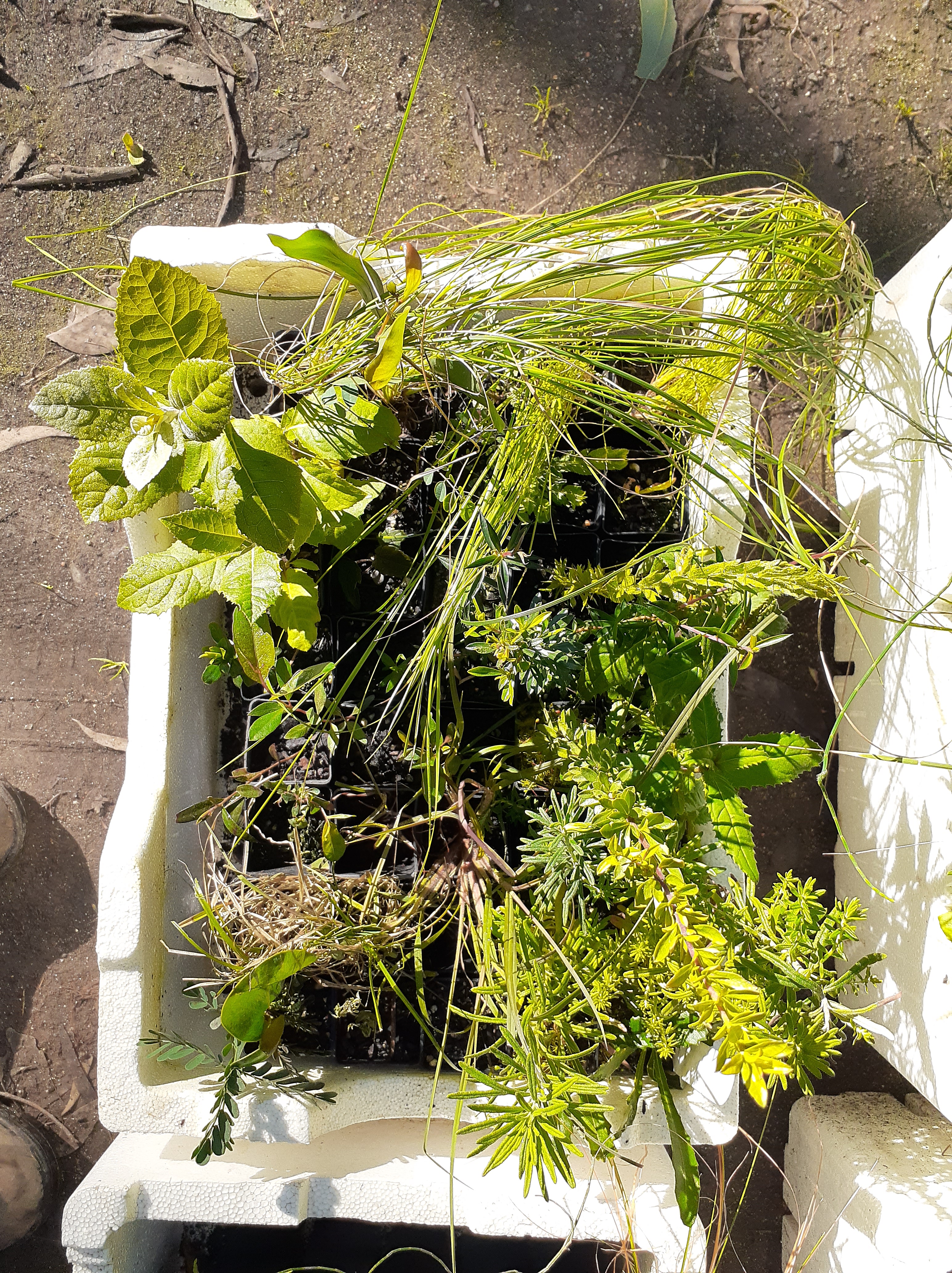 Each Box of Habitat comes with approx 48 plants – carefully selected to suit the Woodend area. They include a range of grasses, ground cover, shrubs and a few trees. We aim to have 10 or more different species in each box.