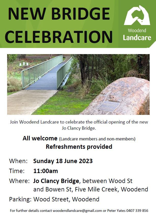 Bridge Opening Celebration June 10, 2023June 13, 2023 / Woodend Landcare Come and join us to recognise the valued contribution that Jo Clancy made to the Woodend community by celebrating the opening of a new bridge named in her honour. Share this: Click to share on Facebook (Opens in new window) Facebook Click to share on X (Opens in new window) X Like Loading... Related