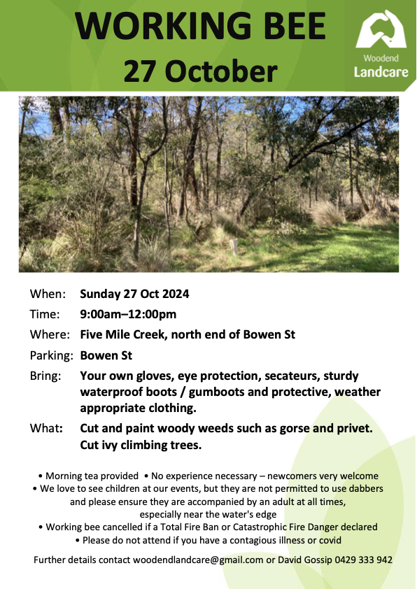 Working Bee – 27 October 2024 October 20, 2024 / Woodend Landcare Join our working bee at 9am this Sunday 27 October to tackle the weeds growing along Five Mile Creek near Bowen Street. Share this: Click to share on Facebook (Opens in new window) Facebook Click to share on X (Opens in new window) X Like Loading... Related