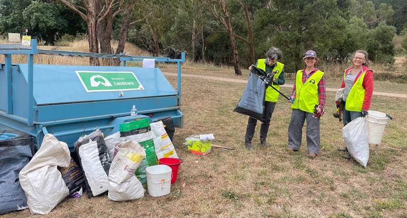On Sunday 2 March, Woodend Landcare volunteers gathered along Five Mile Creek. We worked between Jeffreys and Campaspe Park for Clean Up Australia Day. While some folk went hunting for litter, others focused on weeds. The low water levels meant we removed rubbish from areas that have been difficult to access in recent years.