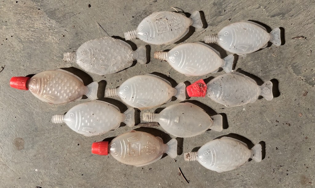 - 11 plastic soy sauce fish (not the type of fish we want in our creek!)