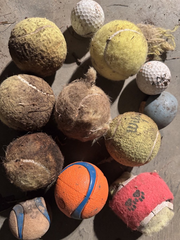 - 12 balls (tennis, golf, dog toys)