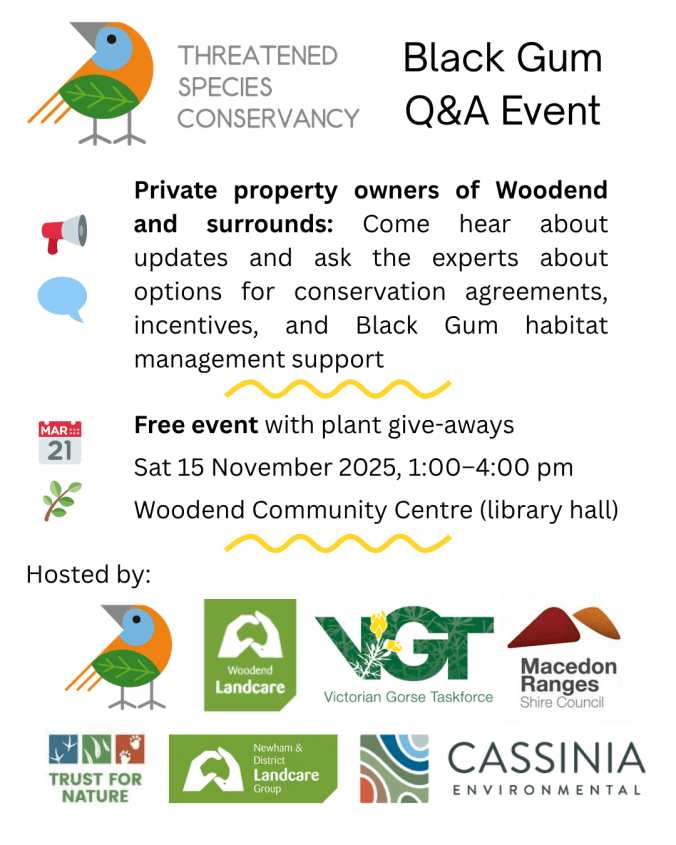Join us 1pm this Saturday 15 Nov at the library to learn about Woodend’s (unofficial) floral emblem, the threatened gum tree, “Black Gum” (Eucalyptus aggregata). Find out how you can help to save this species from extinction by planting some on your own property and protecting any you may already have, through actions such as revegetation and gorse control.