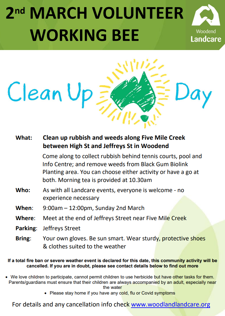 Clean Up Australia Day occurs annually on the first Sunday in March. This year we are removing rubbish and weeds along Five Mile Creek between Jeffreys St and High St. Everyone is welcome to help us take positive and practical action to clean up Woodend!