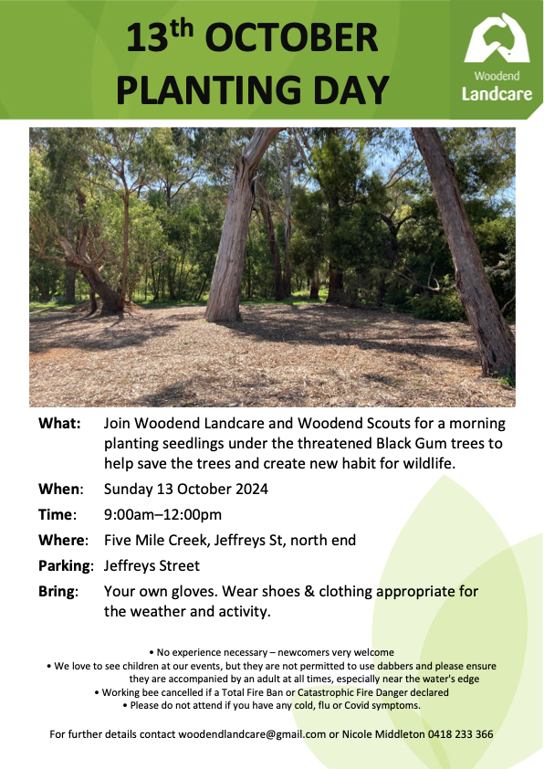 To protect the remaining black gums we are providing them with a buffer of understorey habitat and weed-free, mulched ground to enable self-propagation. Starting at 9am, on Sunday 13 October, Woodend Landcare, with help from our local Scouts, Council staff and anyone who would like to join in, will be planting a further 700 indigenous plants in these areas.